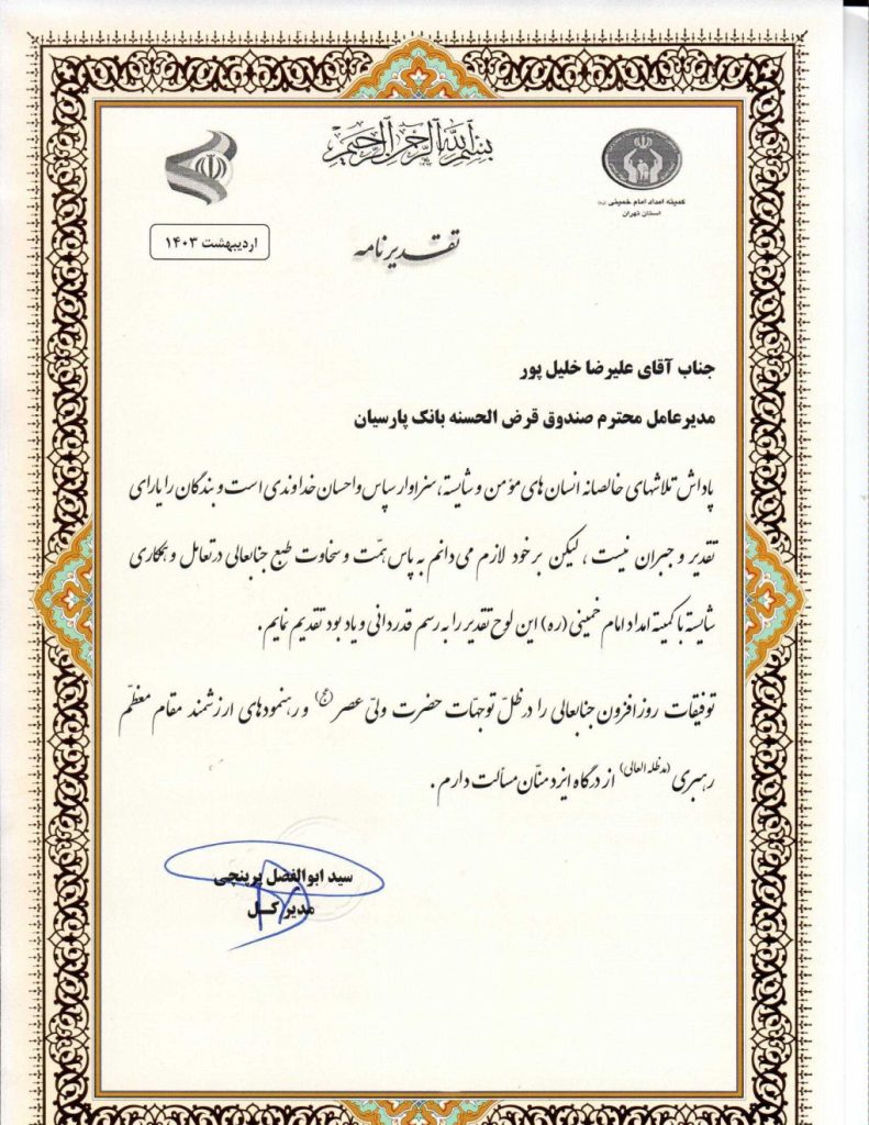 تقدیر مدیرکل کمیته امداد امام خمینی (ره) استان تهران از صندوق قرض‌الحسنه بانک پارسیان