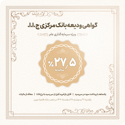 اوراق گواهی ودیعه بانک مرکزی جمهوری اسلامی ایران با نرخ سود 5 / 27 درصد (سالیانه) در روزهای یکشنبه 27 و دوشنبه 28 اسفندماه 1402در شعب بانک اقتصادنوین در سراسر کشور عرضه میشود.
