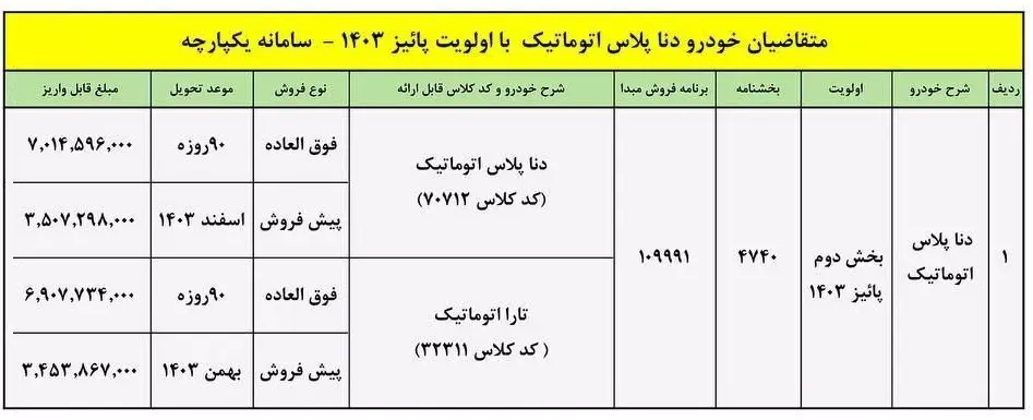به گزارش پایگاه خبری ” چرخ اقتصاد” به اطلاع نمایندگی های محترم می رساند شرایط انتخاب و واریز وجه و ثبت نام به تعداد محدود برای متقاضیان خودرو دنا پلاس اتوماتیک با اولویت های پاییز ۱۴۰۳ سامانه یکپارچه، مطابق جدول ذیل ایجاد شده است.