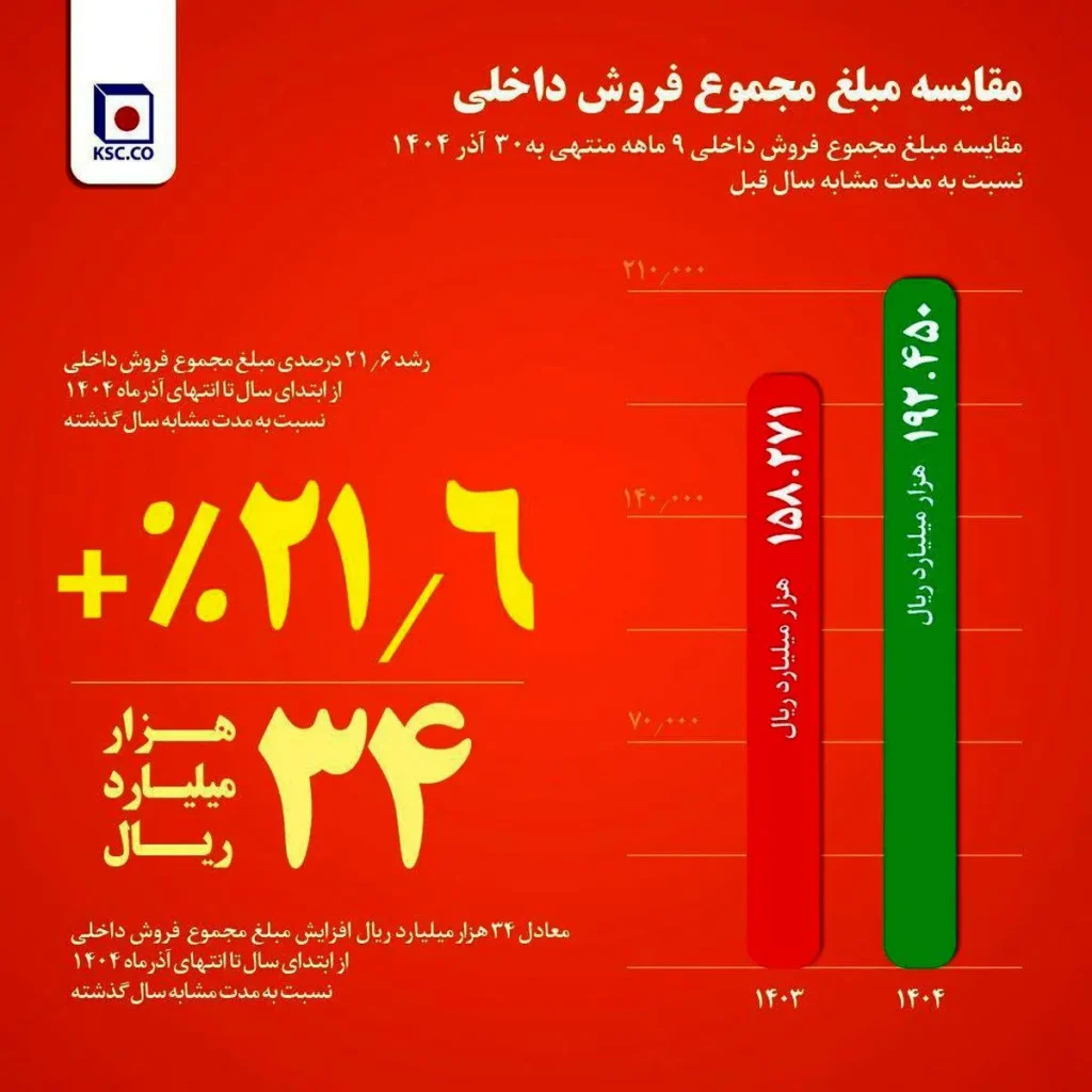 بر اساس عملکرد ثبتشده، مجموع فروش داخلی شرکت در این دوره به ۱۹۲ هزار و ۴۵۰ میلیارد ریال رسیده است؛ رقمی که در مقایسه با ۱۵۸ هزار و ۲۷۱ میلیارد ریال مدت مشابه سال گذشته، از افزایش بیش از ۳۴ هزار و ۱۷۹ میلیارد ریالی و تحقق رشد ۲۱.۶ درصدی فروش داخلی حکایت دارد.