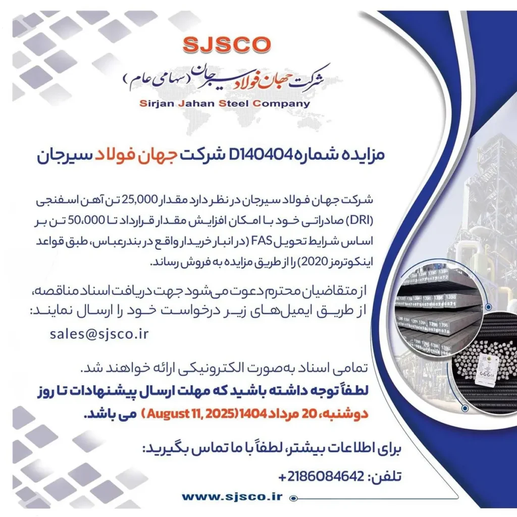 شرکت جهان فولاد سیرجان در نظر دارد مقدار ۲۵,۰۰۰ تن آهن اسفنجی (DRI) صادراتی خود با امکان افزایش مقدار قرارداد تا ۵۰،۰۰۰ تن بر اساس شرایط تحویل FAS (در انبار خریدار واقع در بندرعباس، طبق قواعد اینکوترمز ۲۰۲۰) را از طریق مزایده به فروش رساند.