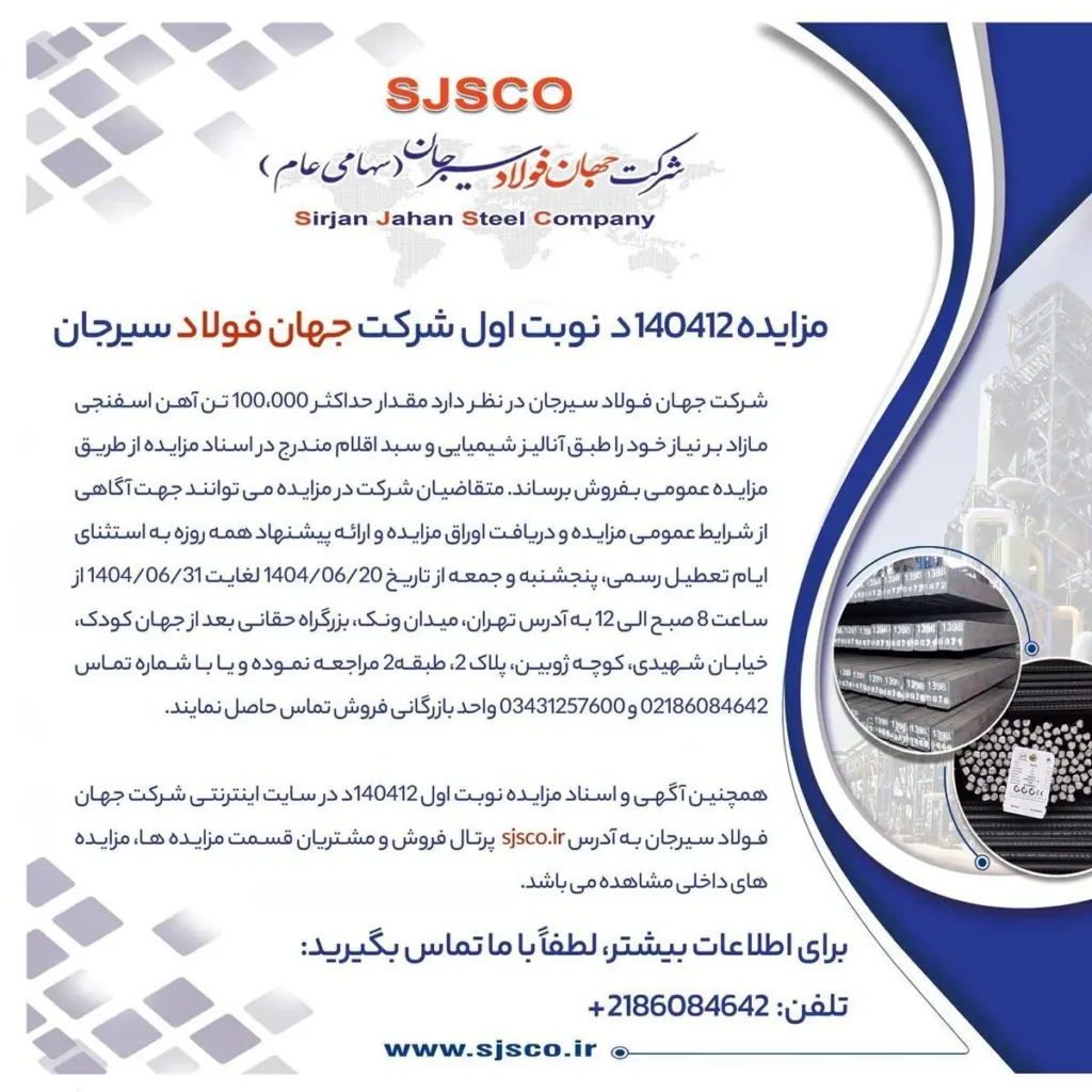 شرکت جهان فولاد سیرجان در نظر دارد مقدار حداکثر 100،000 تن آهن اسفنجی مازاد بر نیاز خود را طبق آنالیز شیمیایی و سبد اقلام مندرج در اسناد مزایده از طریق مزایده عمومی بفروش برساند. متقاضیان شرکت در مزایده می توانند جهت آگاهی از شرایط عمومی مزایده و دریافت اوراق مزایده و ارائه پیشنهاد همه روزه به استثنای ایام تعطیل رسمی، پنجشنبه و جمعه از تاریخ 1404/06/20 لغایت 1404/06/31 از ساعت 8 صبح الی 12 به آدرس تهران، میدان ونک، بزرگراه حقانی بعد از جهان کودک، خیابان شهیدی، کوچه ژوبین، پلاک 2، طبقه2 مراجعه نموده و یا با شماره تماس 02186084642 و 03431257600 واحد بازرگانی فروش تماس حاصل نمایند.