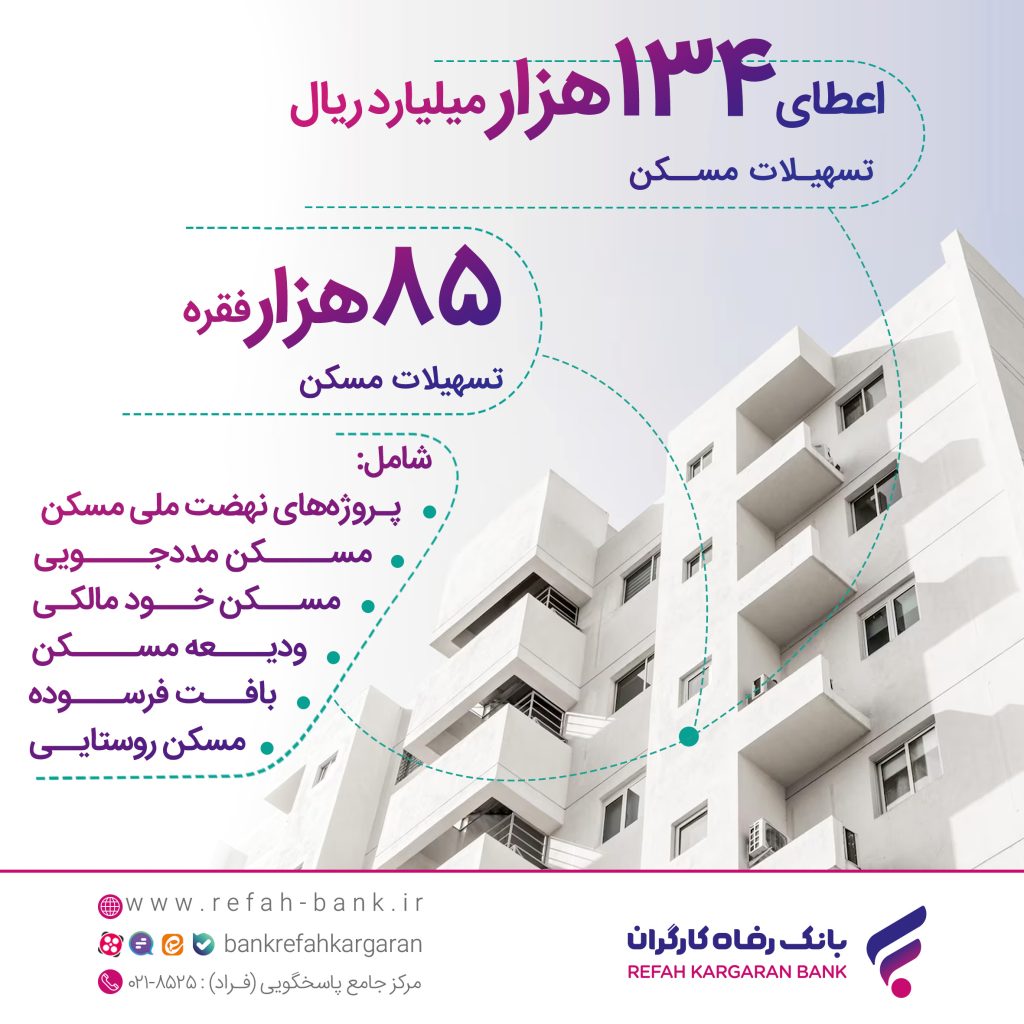 چرخ اقتصاد؛ این تسهیلات در سرفصلهای خودمالکی، ودیعه مسکن، پروژههای نهضت ملی مسکن، بافت فرسوده، مرمت و مقاومسازی واحدهای مسکونی، روستایی، نخبگان، اعضاء هیئت علمی، خانواده معظم شهدا، جانبازان و ایثارگران معزز، و…. به متقاضیان واجد شرایط پرداخت شده است.