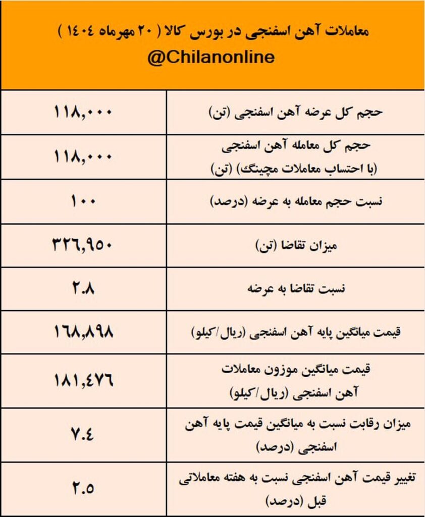 ۲۰ مهر ماه ۱۴۰۴، بورس کالا میزبان عرضه ۱۱۸ هزار تن آهن اسفنجی بود که با توجه به ثبت تقاضای ۲.۸ برابری نسبت به عرضه، ۱۰۰ درصد عرضهها مورد معامله قرار گرفت.
