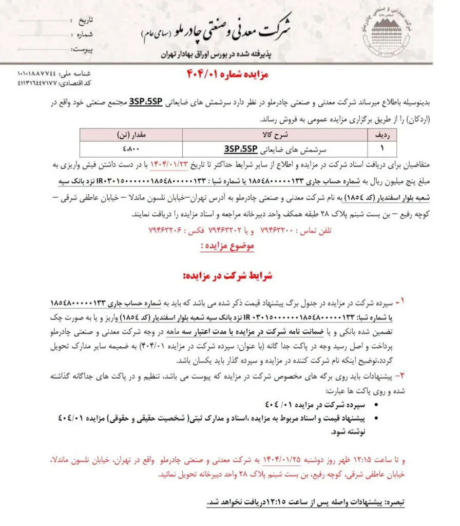 شرکت معدنی و صنعتی چادرملو در نظر دارد ۴ هزار و ۸۰۰ تن سرشمشهای ضایعاتی ۳SP و ۵SP مجتمع صنعتی خود واقع در اردکان را از طریق برگزاری مزایده عمومی به فروش رساند.