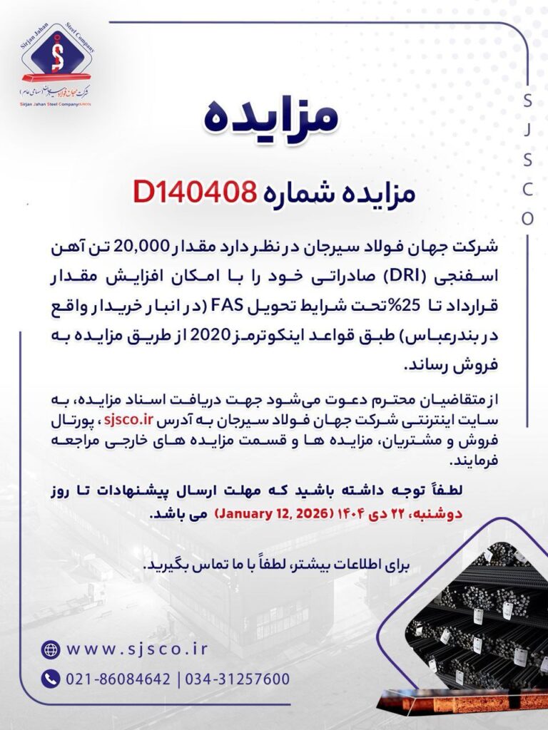 مزایده شماره D140408 شرکت جهان فولاد سیرجان شرکت جهان فولاد سیرجان در نظر دارد مقدار 20,000 تن آهن اسفنجی (DRI) صادراتی خود را با امکان